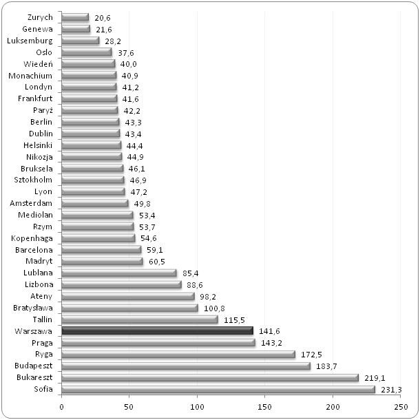 Najnowszy raport przygotowany przez szwajcarski bank UBS nie pozostawia złudzeń. Mimo tego, że sytuacja na polskim rynku pracy systematycznie się poprawia, czas pracy w którym mieszkańcy Warszawy muszą pracować na jednego smartfona znacznie odbiega od średniej dla europejskich miast. Zatrudnieni w polskiej Stolicy, aby zarobić na jednego iPhona muszą spędzić w pracy przeciętnie 142 godziny, a więc około 3,5 tygodnia. Dla porównania średnia dla wyszczególnionych miast wynosi tylko 77 godzin. Z kolei mieszkańcom Zurycha, Genewy i Luksemburga wystarczy mniej niż 30 godzin, a więc niecały tydzień pracy. Po drugiej stronie bieguna znajduje się Sofia i Bukareszt. Mieszkańcy tych miast, aby zarobić na jednego iPhona, muszą poświęcić na obowiązki zawodowe powyżej 200 godzin.